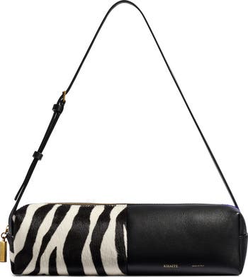This lookbook-featured shoulder bag is designed in an elongated east/west silhouette inspired by a classic pencil case and crafted in an eclectic patchwork of leather and calf hair. A textured Empire zip pull adds a signature touch.