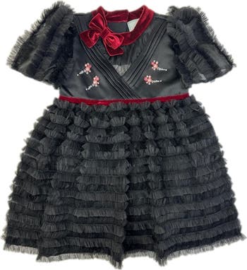Captivate everyone's attention in the Kylie Dress, crafted from lightweight black tulle and organza for a stunning look. Perfect for any special occasion, this beautiful dress will make your little girl feel like a Princess. The skirt is made of layers of sheer tulle and flowing organza, creating a soft and ethereal effect as the fabric moves with the child.