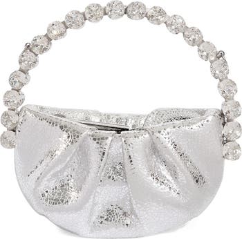 A sparkling Swarovski-crystal top handle suspends a softly gathered pouch of supple leather on this statement-making bag.
