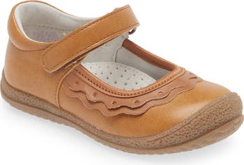 Scalloped ruffles sweeten the silhouette of a leather mary jane grounded by a cushioned, arch-supporting footbed and an adventure-ready rubber sole.