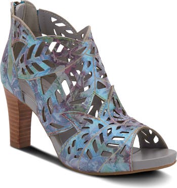 Lacy laser-cut designs and a hand-painted finish make this stacked-heel sandal the height of sophistication.