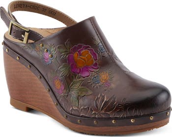 An embossed floral pattern and antique studs bring whimsical charm to a slingback clog lifted by a subtle platform and stacked wedge heel.