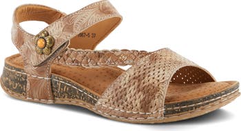 Floral hardware graces the richly textured straps of this dreamy handcrafted sandal featuring intricate embossing and a cushy, supportive footbed.
