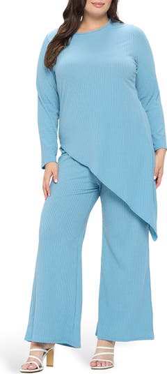 Achieve a new angle on casual set dressing with this ribbed duo that features an asymmetric top and wide-legged pants.