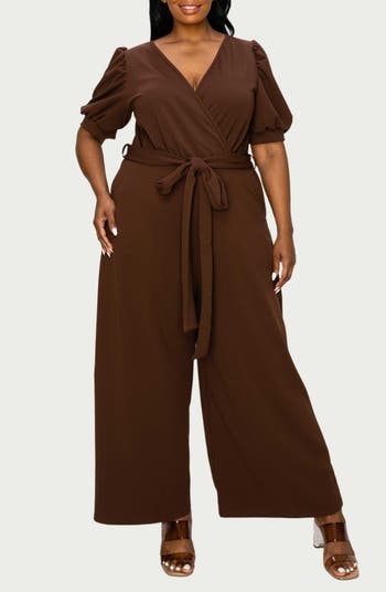 Pretty puffed sleeves frame this fabulous and stretchy wide-leg jumpsuit popped with handy pockets and tethered at the waist by a matching sash.