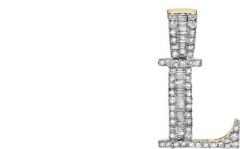 This L initial pendant is crafted in 10K Yellow Gold and features 0.52 carats of G SI1 diamonds. The design combines natural round and baguette diamonds to create a look full of brilliance texture and dimension. With expert craftsmanship and a sleek profile this pendant adds a refined personal touch to any style. CHAIN NOT INCLUDED.