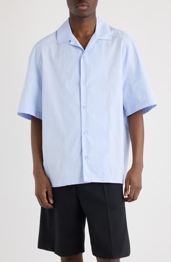 Designed for warm days and strong exits, this relaxed button-up teams airy comfort and a cool notched collar then pulls focus to a sweeping back monogram stitched in bold script.
