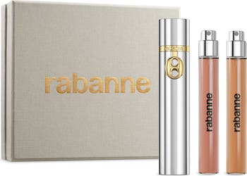 - La Collection Rabanne Travel Spray Case: a sleek metallic silver case adorned with the iconic “Eight” jewel, signature of the Maison. Designed to host one of the most-wanted 0.5-ounce La Collection Rabanne creations