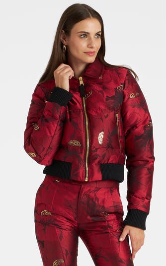 Layer-up in luxury with our La Comasca Mini Bomber: puffy, petite friendly and ready to party this holiday season. Done in plush jacquard in this stunning Ruby motif, it has all the hallmarks of a classic bomber silhouette with its ribbed hem hitting just below the waist to give your evening look plenty of shape. Serves up vintage attitude whether you style it with our new Baby cocktail dress and platforms or your fave blue wash jeans.