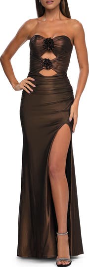 Strapless net jersey dress with front cutouts and a lace up adjustable back. The front features two rose flowers. Back zipper closure.
