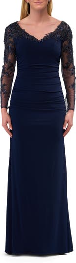 Chic ruched jersey dress with a V neckline and sheer long sleeves. The sleeves features stunning beaded lace applique. Back zipper closure.
