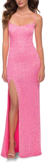 Long neon sequin gown with square neckline and leg slit. Features a criss cross hook and eye open strappy back. Back zipper closure.