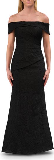This elegant off-the-shoulder gown features a beautifully textured fabric that adds subtle dimension and sheen. The asymmetrical ruching flatters the waist and hips, while the softly flared skirt creates a timeless silhouette. Back zipper closure.
