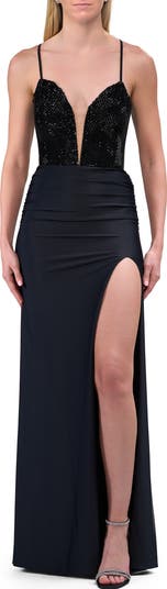 Gorgeous fitted dress with a ruched jersey skirt and slit. The bodice is fully encrusted with square rhinestones and features a deep mesh V neckline. Lace up adjustable straps on the back. Back zipper closure.