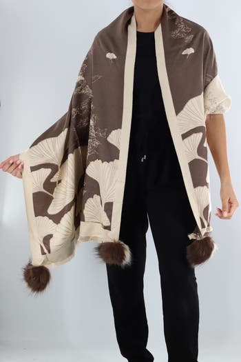 The shawl features a nature-inspired print, possibly ginkgo leaves, and is trimmed with beige borders. It also has decorative pom-poms hanging from the bottom corners.