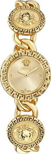 A Greca-border motif and Medusa-head accents inspired by the molded door of Versace's first headquarters put house-signature flourishes on this Swiss-quartz timepiece made in a bracelet-style silhouette.