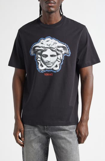 House codes collide on this Italian-cotton jersey T-shirt, where Versace's Greek-key detailing outlines the signature Medusa-head mascot—a nood to the molded door of the maison's first headquarters.