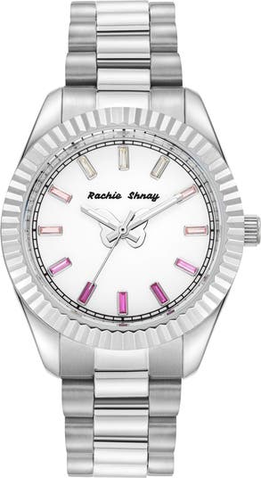 Baguette-cut crystal markers create an ombrè effect on the dial of an automatic timepiece boasting a coin-edged bezel and a polished butterfly centerpiece.