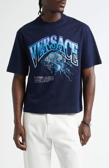 Versace plunges into the deep with this Italian-made cotton T-shirt, where a luminous jellyfish graphic embodies the label's dangerously glamorous aesthetic. The soft, breathable fabric keeps it wearable, while the design speaks to untamed luxury beneath the surface.