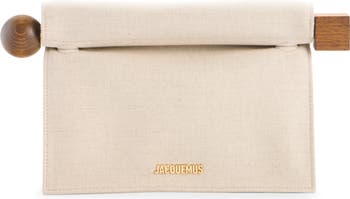 Named for its sculptural round and square hardware, this leather-trimmed canvas clutch has a boxy, roll-top shape modeled after takeout bags.