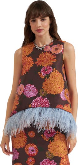 As far as interesting silhouettes go, the La Scala top may win the gold star. Prime for summer weddings, black tie beach parties and beyond, the alluring trapeze silhouette is crafted in our shimmering new Gyn jacquard and hemmed with a fabulous feather trim. Undoubtedly dazzling styled with the stunning Pencil Skirt to match, we also love it with denim cut-offs for a maximalist gelato run moment.