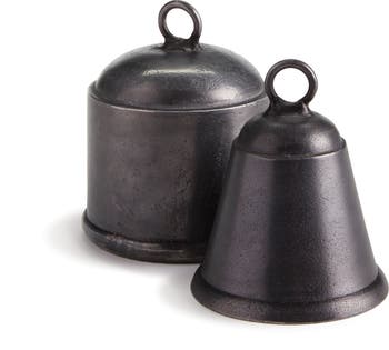 Old fashioned objects in cast aluminum, these historic shapes are functioning bells. Place atop a stack of art books on the ottoman or arrange in a bookshelf for a classic look.