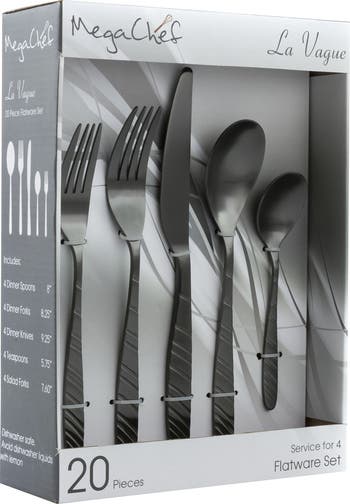 The MegaChef La Vague 20-piece Flatware Set is made of high quality food grade stainless steel, the quality material in high standard resists corrosion and rust, ensures long-lasting use. The La Vague Silverware Set is smoothly finished with no sharp edges, safe and comfortable for both adults and children. Each piece in this Utensil Set is versatile and perfectly weighted and balanced to feel comfortable in your patrons hands. With its proper sizes this set can fit perfectly with your other dinnerware or tableware sets.