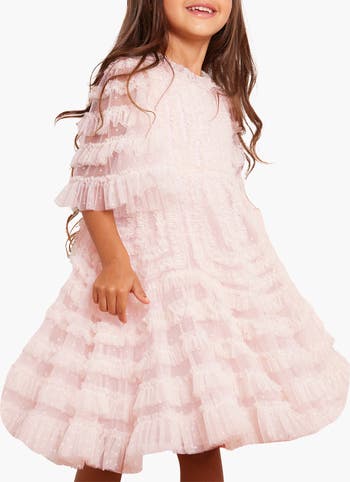 The La Vie En Rose Kids Dress is adorned with delicate tulle ruffles, engineered throughout the panels to enhance the silhouette. Crafted with gathered tulle in a contrast colour to the base fabric creates a soft, gentle effect. The perfect dress for all their upcoming special events.