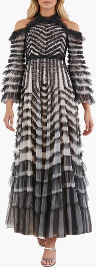The La Vie En Rose Off Shoulder Gown. Designed with delicate ruffles cascading from the neckline down the panels, framed with contrast trims and gathered frills, the silhouette is soft and structured. A romantic and ethereal gown ideal for modern fairytale moments.