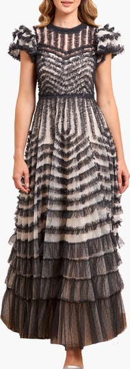 The La Vie En Rose Round Neck Short Sleeve Gown has a romantic silhouette with contrast detailing. Layered ruffles trim the bodice and skirt, while soft gathers define the shape. The contrasting tones enhance the femininity with a modern edge, making it a versatile choice.