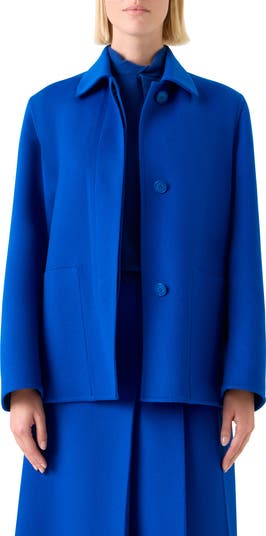A hidden-button placket maintains the minimalist aesthetic of a double-face cashmere jacket rendered in a vivid blue hue.