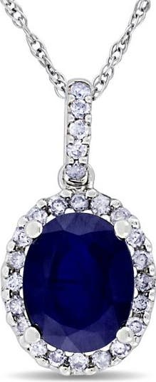 - Wear this lab blue sapphire and halo lab grown diamond pendant necklace for a regal update to your look.This pendant features an oval shaped diffused lab blue sapphire framed by a lab grown diamond halo and lab grown diamond accents on the pendant loop. This pendant necklace is set in 14 yellow gold, has a total weight of about 2.90 total carats, and comes along with a 16 inch and 18 inch long chain.