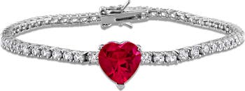 This beautiful station tennis bracelet is crafted in sterling silver and showcases a created-gemstone at the center with sparkling round-cut created white sapphires along the length of the bracelet. This bracelet measures 7.25 inches in length and is enhanced with a high polish finish.