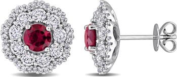 These beautiful earrings are crafted in 14k white gold and showcase round-cut lab-created ruby gemstone in the center surrounded by sparkling lab-grown diamonds in an elegant floral halo design. These earrings are enhanced with a high polish finish and are secured with butterfly back closures.