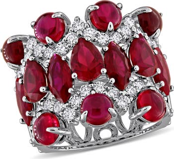 This beautiful ring is crafted in 14-karat white gold and showcases sparkling pear, marquise and round-cut lab-created ruby gemstones with dazzling round-cut lab-grown diamonds in a stunning cluster eternity design. This ring is enhanced with a high polish finish and is an ideal choice for those who appreciate unique designs and sustainable luxury.