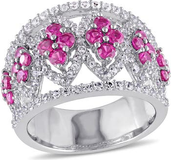 This opulent Floral Vintage Ring is crafted in lustrous sterling silver, this elegant ring features 16 round-cut, prong-set, eight round-cut, pave-set lab-created ruby gemstones and round-cut, prong-set lab-created white sapphire gemstones placed across the wide band. Polished to brilliance, this enchanting ring with vintage design is perfect.