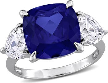 This beautiful 3-stone ring is crafted in sterling silver and showcases a large cushion-cut 11mm lab-created blue sapphire with heart-cut lab-created white sapphires on each side in a classic 3-stone design. This ring is enhanced with a high polish finish.