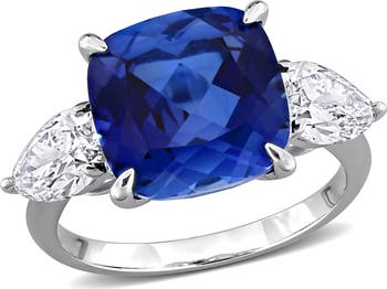 This beautiful ring is crafted in 18k white gold and showcases a large 11mm cushion-cut lab-created sapphire gemstone in the center with dazzling pear-cut lab-grown diamond side stones in a classic 3-stone design.