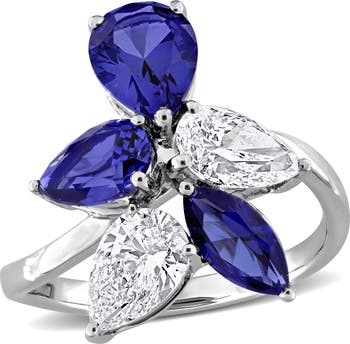 This beautiful ring is crafted in 18k white gold and showcases pear and marquise-cut lab-created sapphire gemstones with pear-cut dazzling lab-grown diamonds in an elegant floral cluster design.