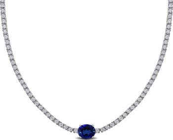 This striking solitaire tennis necklace features combining lab-created blue and white sapphires set in sterling silver. The centerpiece is a captivating blue sapphire, exuding a deep, vibrant hue that symbolizes wisdom and royalty, surrounded by shimmering white sapphires that enhance its brilliance. The sterling silver setting provides a sleek and durable backdrop, ensuring the gems catch and reflect light beautifully. This necklace, measuring 17 inches in length, offers a bold yet elegant statement piece suitable any occasion.