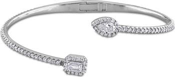 This beautiful open bangle bracelet is crafted in 14k white gold and showcases a pear and emerald-cut lab-grown diamond at each end with round-cut lab-grown diamonds in a halo and classic tennis design. This bracelet measures 6-inch in length and is enhanced with a high polish finish.