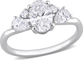 This lovely engagement ring is crafted in lustrous 14k white gold and features two pear-cut, prong-set lab-grown diamonds, two round-cut, prong-set, lab-created diamonds and one oval-cut, prong-set, lab-created diamond mounted on the band for a shining look. Enhanced with a polished finish, this engagement ring will always be a symbol of love and commitment.