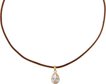 Lab Grown Diamond Pear Bezel Brown Leather Chain Necklace 14K
