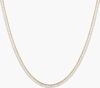 Tennis lovers on a budget, rejoice. Our Lab Grown White Sapphire Baguette Tennis Necklace is everything you need. Get the look of real diamonds without the hefty price tag, no gemstone shaming here at all. Select from 13ct or 27ct weights to add major sparkle to your necklace stack. Shop the entire tennis collection here.