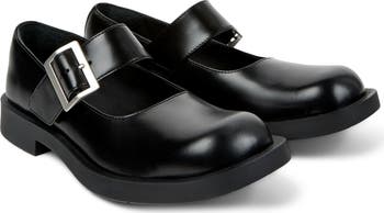 A slightly upturned toe modernizes this mary jane shoe that's charmed with a chunky sole and a wide, polished strap.