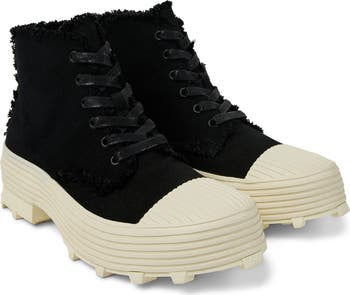A ribbed midsole and chunky lugs add contemporary impact to a cap-toe boot fashioned from raw-edged canvas and vulcanized rubber.