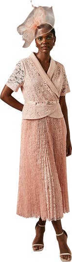 This stunning Coast 2 in 1 jacket dress showcases British elegance at its finest. The intricate lace bodice creates a refined wrap-style jacket effect, beautifully contrasting with the flowing pleated skirt for a look that conveys sophistication and grace. The belted waist detail defines your silhouette whilst the midi length offers a contemporary touch to this classic design.