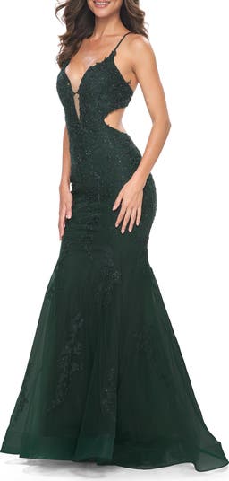Lace and Tulle Mermaid Gown with Side Cut Outs in Jewel Tones