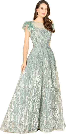 Flowing ombre lace ballgown featuring cap sleeve feather details. This dress features a modest illusion neckline and glittering rhinestones throughout.