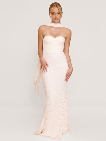 Dahlia is the perfect lace dress for a registry office or the big white wedding. Crafted in textured lace, the gown features a fully boned bodice for sculpted support and a clean bandeau neckline that feels both contemporary and timeless. A chiffon contrast scarf drapes effortlessly, adding a touch of romance. Head to toe luxury lace fabric- Sold with a separate chiffon neck/shoulder scarf- Full Lining- Zip Fasten